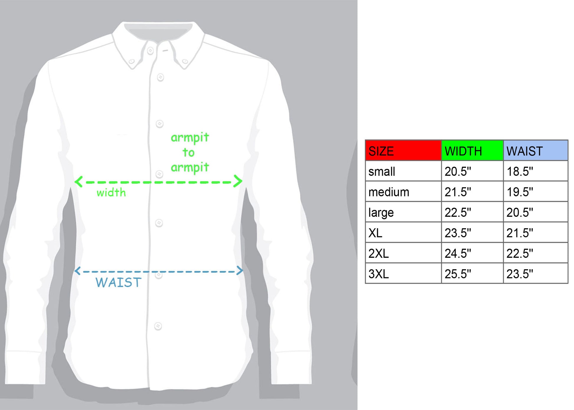 - In order to properly compare, lay a shirt you have flat and buttoned up, measure it from armpit to armpit and compare it to one of these measurements.👇 (green line )